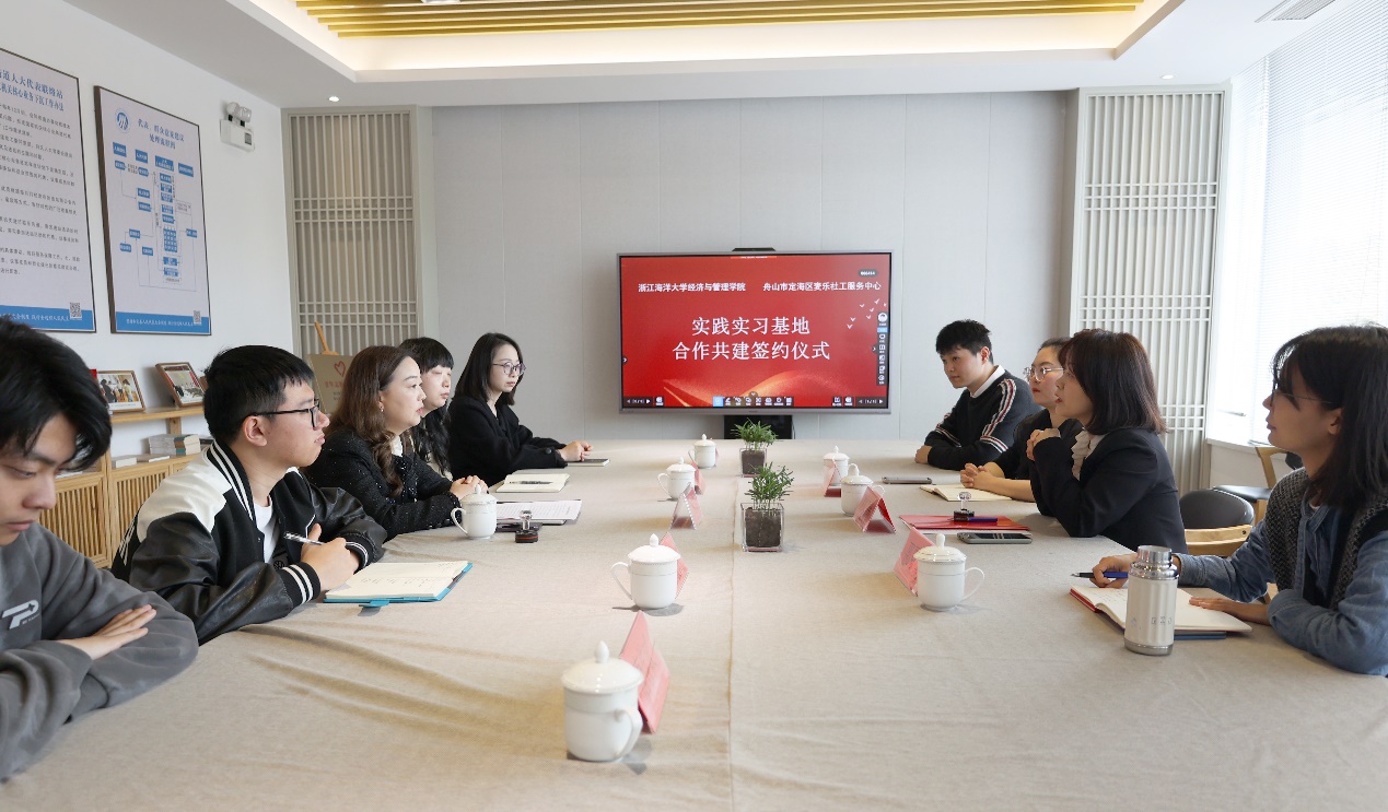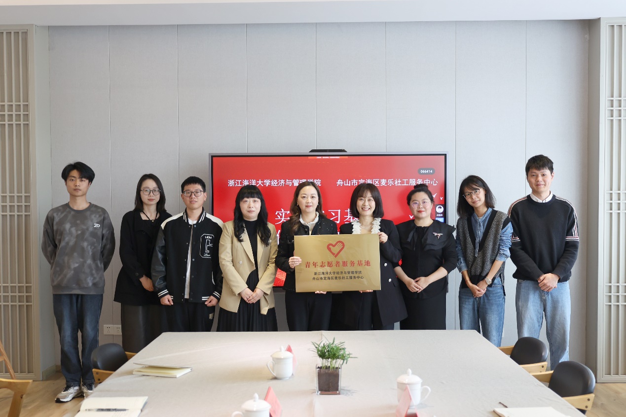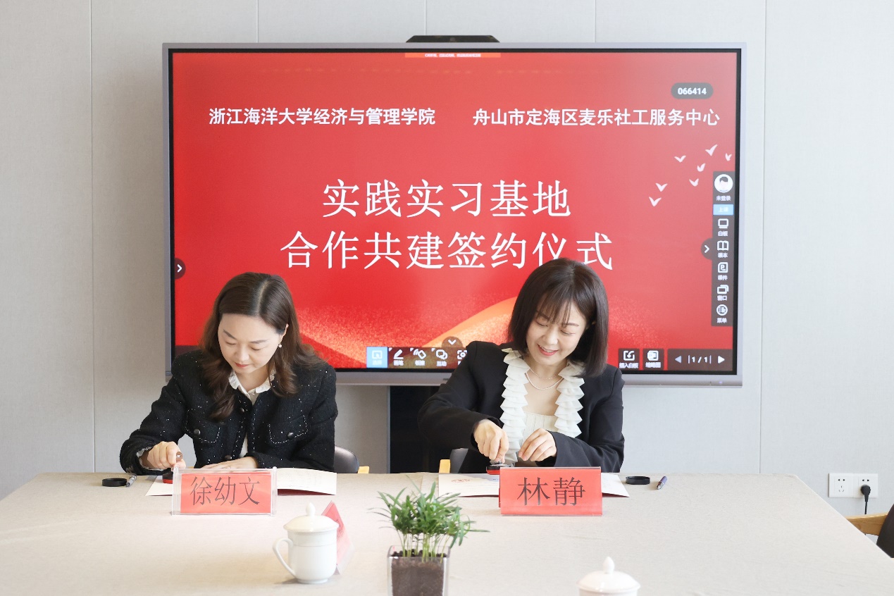 浙江海洋大学经济与管理学院党委副书记徐幼文与麦乐社工服务中心理事长林静共同签署校地共建合作共建协议书,并共同为浙江海洋大学经济与管理学院和舟山市定海区麦乐社工服务中心青年志愿者服务基地揭牌。