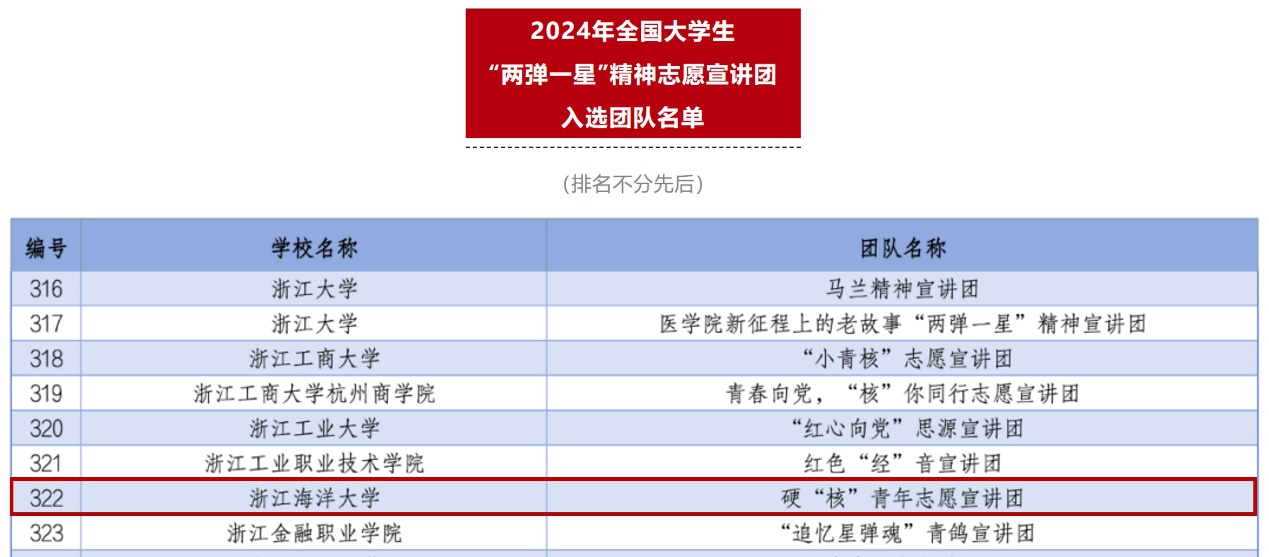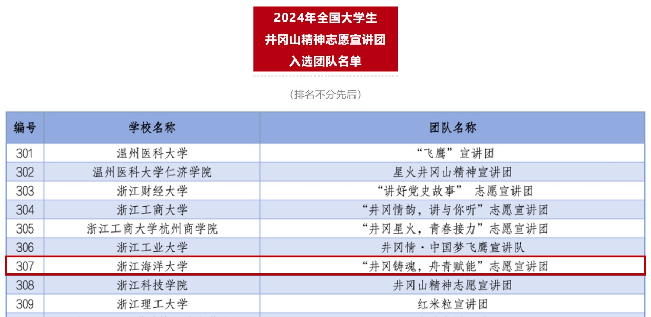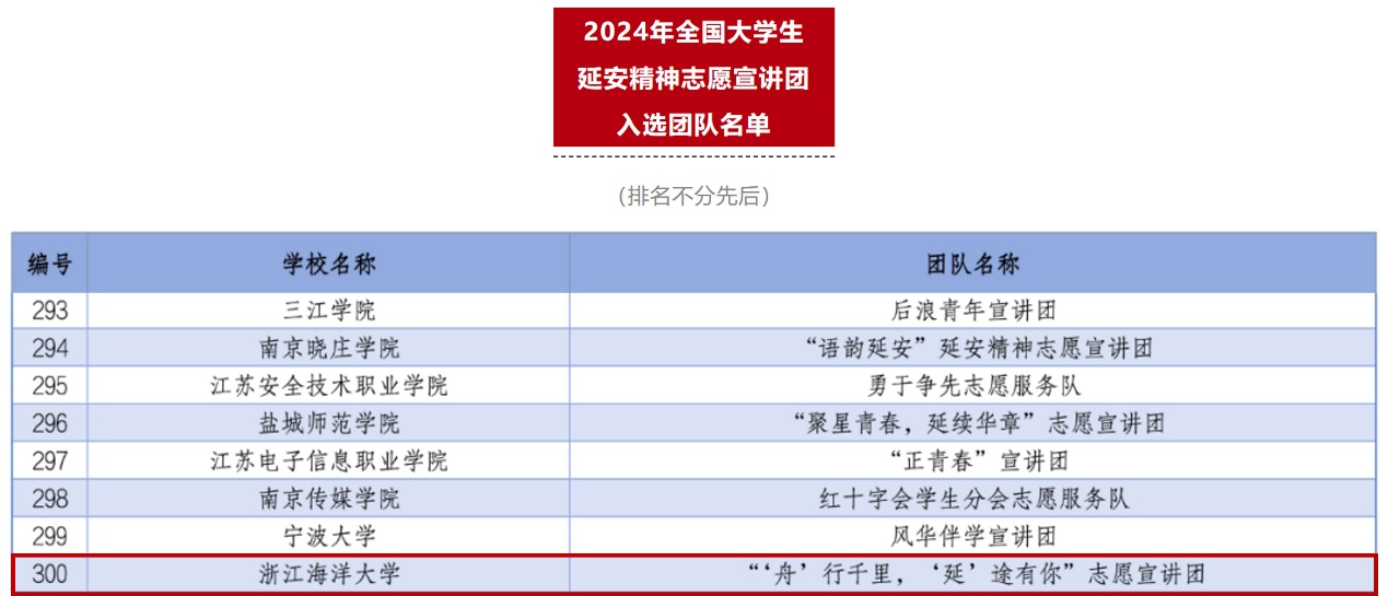 2021年9月,党中央批准了中央宣传部梳理的第一批纳入中国共产党人精神谱系的伟大精神,它们是百年大党特有的政治优势和成功奥秘,也充分展现了共产党员的高尚风范和道德品格。近日,团中央青年志愿者行动指导中心联合相关单位部门发布了《关于遴选2024年全国大学生井冈山精神志愿宣讲团的公告》《关于遴选2024年全国大学生延安精神志愿宣讲团的公告》《关于遴选2024年全国大学生“两弹一星”精神志愿宣讲团的公告》。活动一经发布,得到了各高校志愿服务团队的广泛关注和积极参与。主办单位对所有申报材料进行了认真审阅。最终,由经济与管理学院申报的浙江海洋大学“井冈铸魂,舟青赋能”志愿宣讲团入选2024年全国大学生井冈山精神志愿宣讲团,浙江海洋大学“‘舟’行千里,‘延’途有你”志愿宣讲团入选2024年全国大学生延安精神志愿宣讲团,浙江海洋大学硬“核”青年志愿宣讲团入选2024年全国大学生“两弹一星”精神志愿宣讲团。