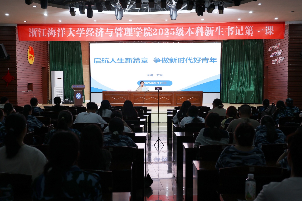 为加强对学院2025级本科新生的思想引领与成长指导,帮助他们尽快适应并融入大学生活,2025年9月19日,经济与管理学院于定海校区活动中心二楼报告厅顺利举办2025级本科新生始业教育之书记第一课。课程由学院党委书记方锐主讲。