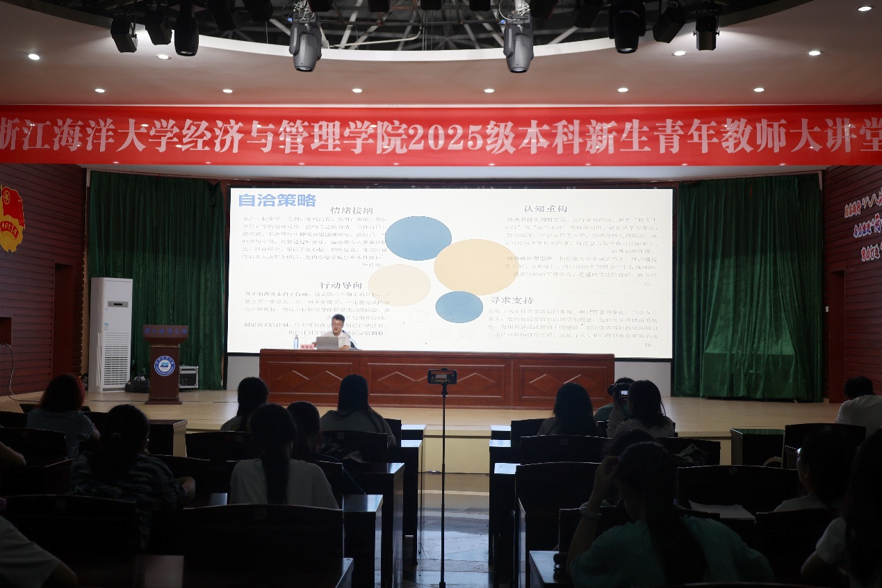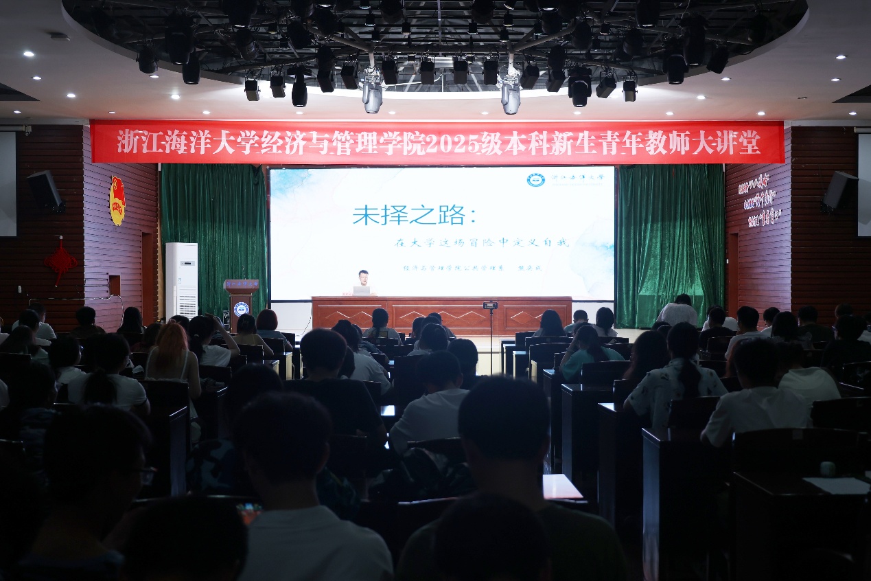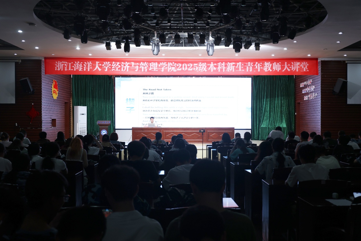 为帮助学院2025级本科新生更快适应大学学习生活、明确成长方向,破解入学初期可能面临的目标迷茫、选择困惑等问题,2025年9月23日,经济与管理学院团委于定海校区活动中心二楼报告厅顺利举办2025级本科新生青年教师大讲堂。本次讲座特别邀请了学院公共管理系博士熊奕成老师分享他的求学历程与成长感悟。学院全体2025级本科新生以“线上 线下”形式参与此次讲座,讲座由学院团委副书记施辰阳主持。