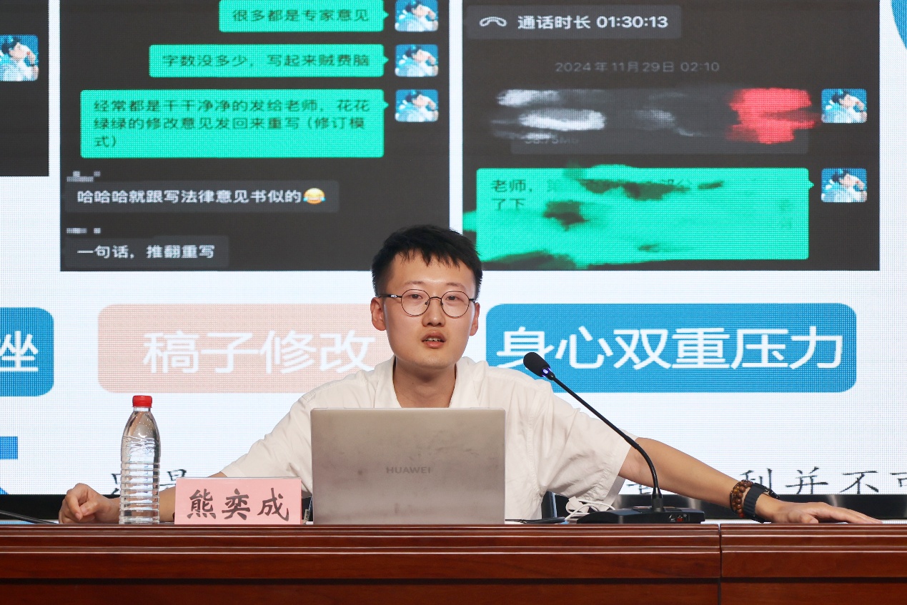 关于自洽,熊老师结合自身经历,分享了首次司法考试失利后的挫败感与压力,以及坚持自学、最终通过考试的心路历程。他总结出情绪接纳、行动导向、认知重构和寻求支持等四种策略,勉励同学们以积极心态面对挑战。他还以硕士阶段预答辩受挫、论文修改和身心双重压力为例,告诉大家,大学里的短暂失利并不可怕,只要保持积极心态、持之以恒地努力,就一定能够在勤学与坚持中积蓄力量,收获成长与进步。