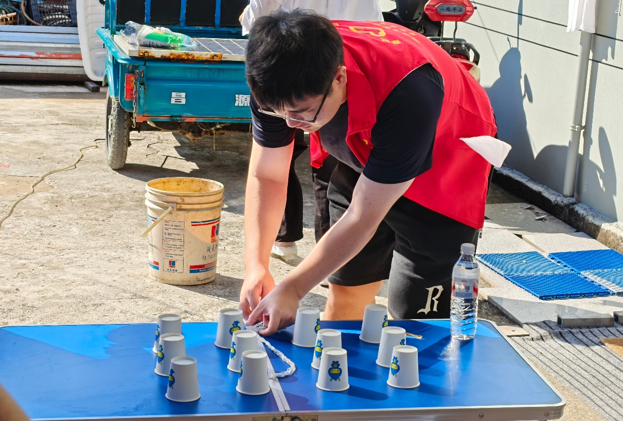 在游戏互动环节,老人们与志愿者们被分为几组,共同参与传乒乓球、叠纸杯等趣味活动。乒乓球在球拍间来回传递,偶尔掉落时,现场响起阵阵笑声;纸杯塔缓缓堆高,当稳稳立住的那一刻,老人们露出自豪的笑容,掌声和欢呼声在海岛上空久久回荡。游戏不仅带来了欢乐,也让彼此的陌生逐渐消融,拉近了青年与老人的心。