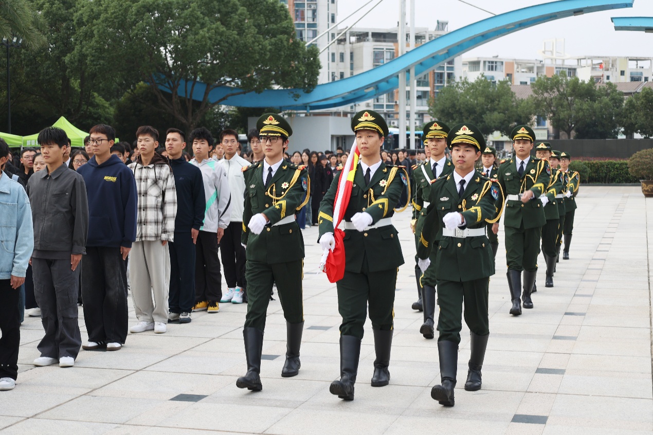 仪式伊始,英姿飒爽的校国防先锋连成员们目光坚毅,迈着铿锵有力、整齐划一的步伐,护卫着鲜艳的五星红旗走向旗台。全体同学庄严肃立,目光追随着那抹跃动的鲜红。“升国旗,奏唱国歌”一声令下,旗手奋力一挥,五星红旗伴着庄严的国歌声冉冉升起,如同一团炽热的火焰,点燃每个人心中的爱国热情。