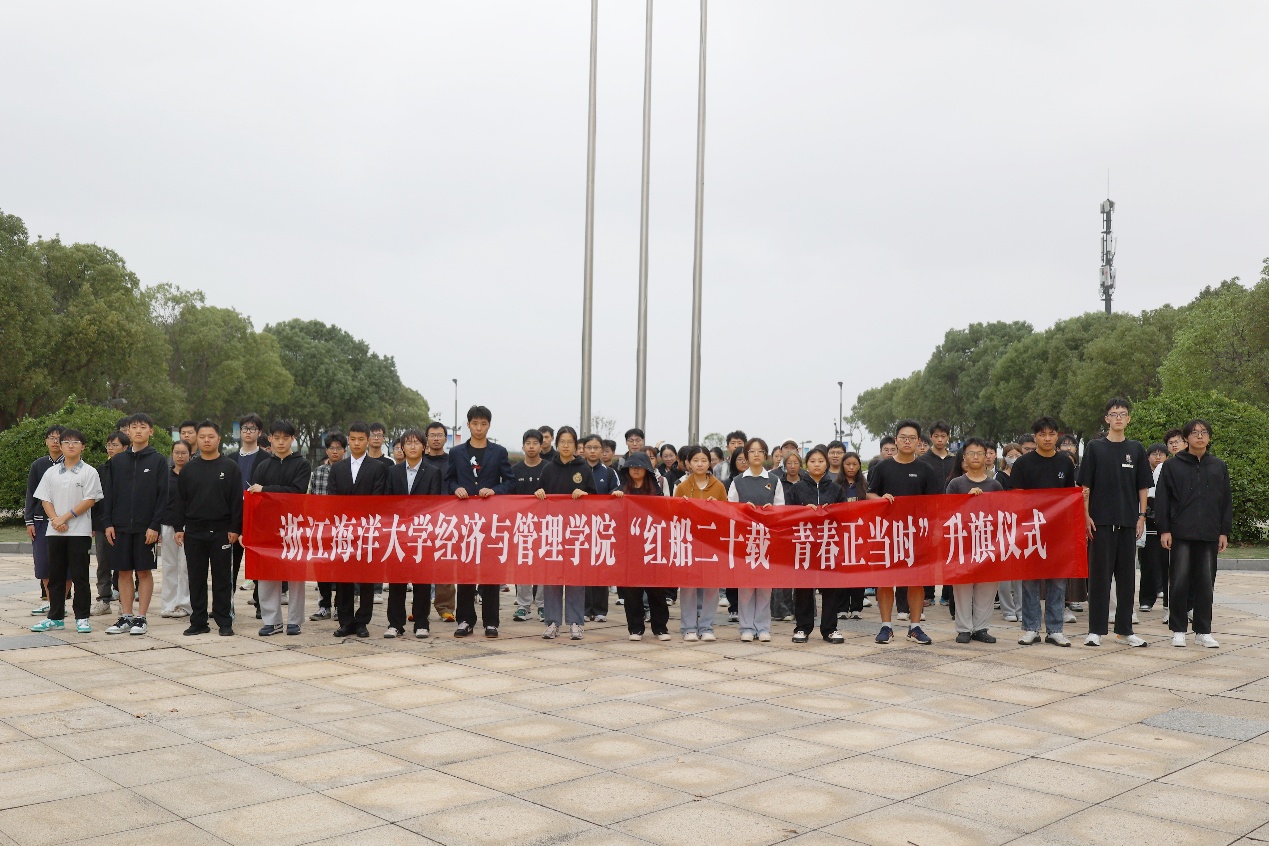 2025年是红船精神提出20周年。为传承红船精神,凝聚青春力量,引导我院青年学子从红色基因中汲取奋进力量,2025年10月20日、27日清晨,伴着微曦的晨光,经济与管理学院于新城和定海两校区顺利开展“红船二十载 青春正当时”新学期升旗仪式。浙江海洋大学国防青年先锋连成员,经济与管理学院各学生党支部党员、入党积极分子,第十七期“青马工程”培训班学员,第十七届团学干部、干事,第四届研会干部、干事及团员和青年代表共400人参加仪式。