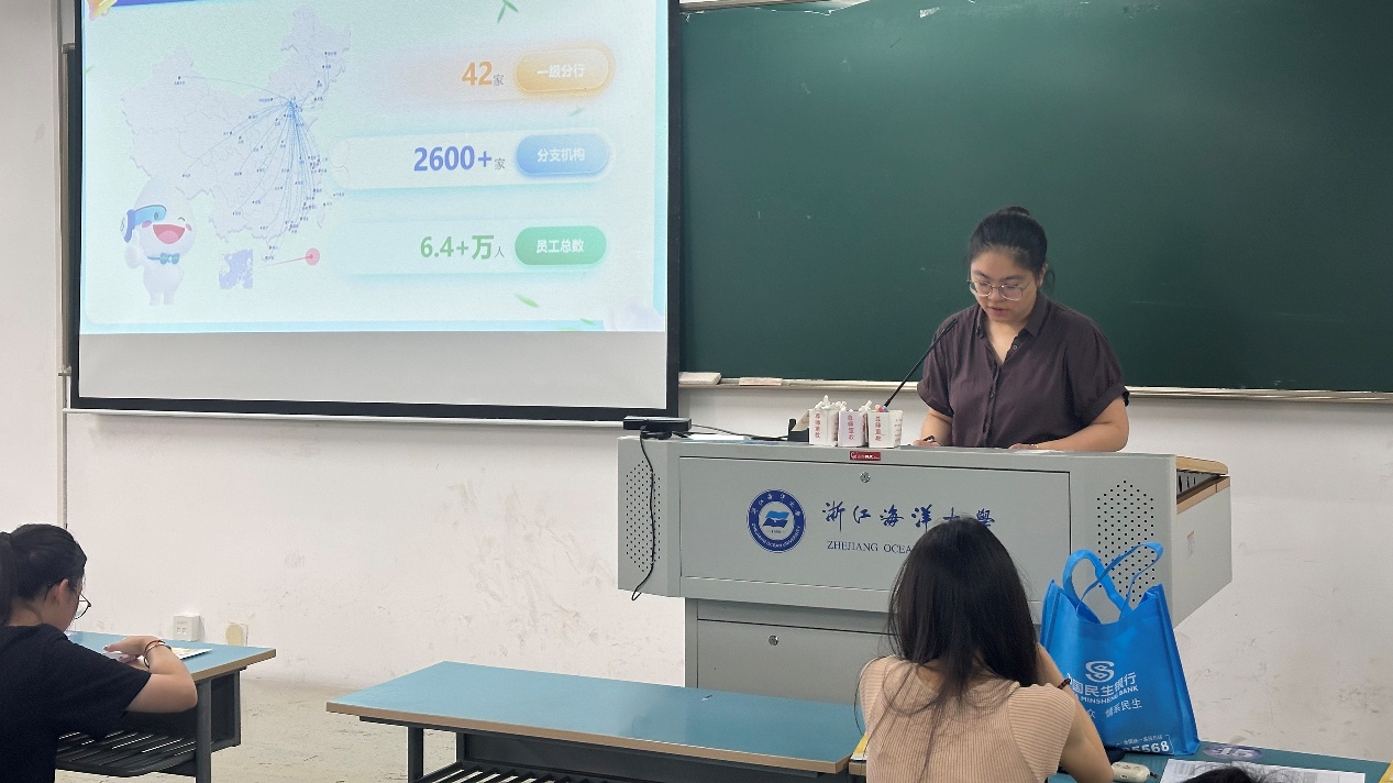 为扎实推进共青团促进大学生就业行动,帮助同学们明确职业方向、梳理就业规划、拓宽就业眼界,经济与管理学院分别于2025年9月24日下午定海校区教学楼2332教室,2025年9月26日下午新城校区公共教学楼123教室,顺利举办民生银行宣讲会。学院共150余位大三、大四学生参与。此次宣讲会由民生银行舟山分行陈相凝经理主讲。