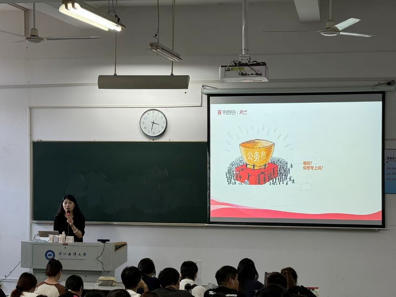 赵丹老师首先从国考、省考入手,简要介绍了浙江选调生的招录安排及考试特点,并对两者的差异进行了分析。随后,她从面试基础知识、面试特点、考场礼仪和语言表达等方面进行了系统讲解,结合生动的案例,详细说明了如何灵活应对面试中的各种问题。同时,赵老师还分别剖析了公务员与选调生面试的形式及考情规律,并与同学们共同探讨了具体情境问题。同学们积极参与互动环节,踊跃提问,现场气氛热烈。在赵老师的精彩讲解下,同学们收获了丰富的就业知识与实用技巧,对未来职业规划有了更加清晰的方向。