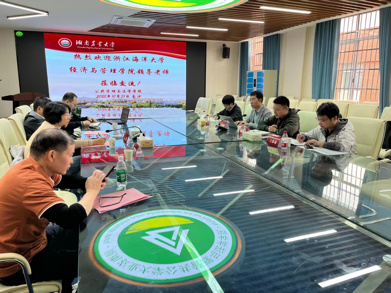 2025年10月31日至11月1日,浙江海洋大学经济与管理学院副院长高猛带队赴湖南农业大学公共管理与法学学院,围绕公共管理学科人才培养开展座谈交流,并前往岳麓山实验室,观摩由湖南省教育厅主办、湖南农业大学研究生院承办、中国行政管理学会等单位协办的湖南省第八届高校公共管理案例大赛。