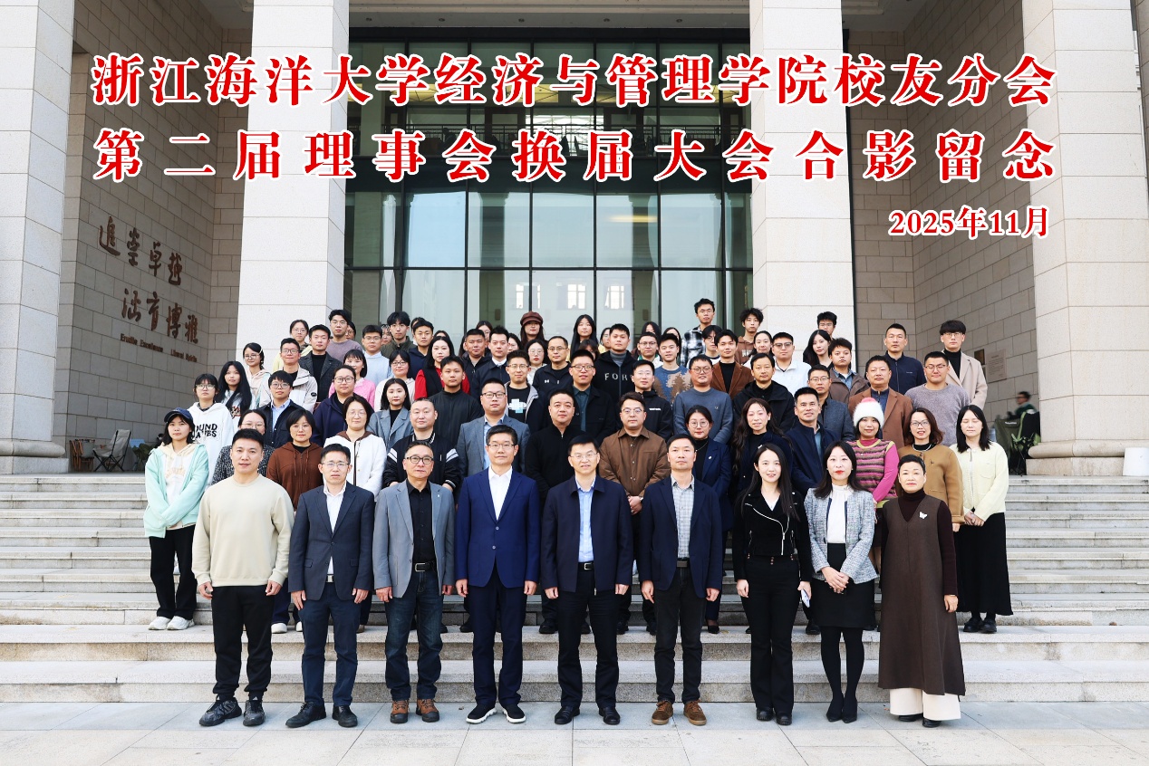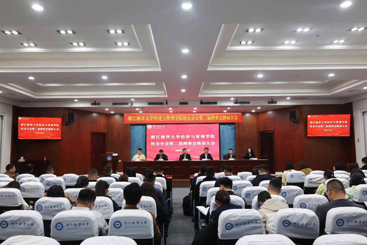 2025年11月22日,浙江海洋大学经济与管理学院校友分会第二届理事会换届大会在新城校区图书馆一楼报告厅顺利召开。学校党委副书记王剑俊、各界校友代表、学院领导班子、教师代表、在校生代表等出席会议。会议由学院党委书记方锐主持。