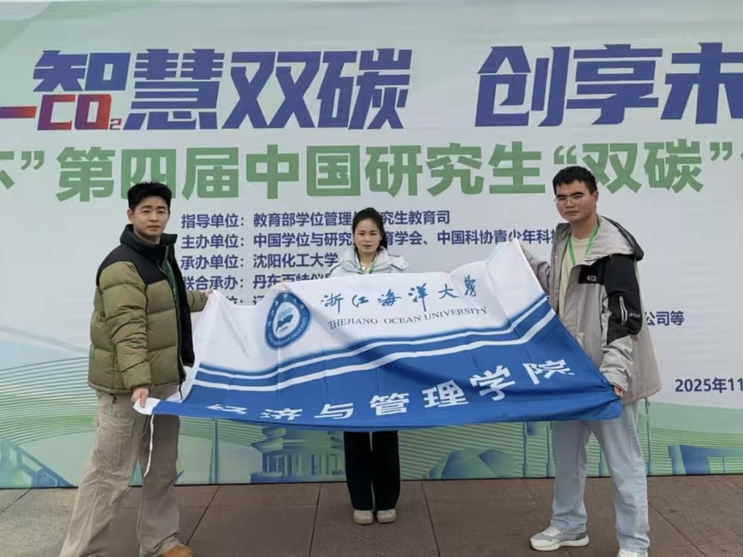 2025年11月7日-9日,由教育部学位管理与研究生教育司指导,中国学位与研究生教育学会、中国科协青少年科技中心主办的“沈化百特杯”第四届中国研究生“双碳”创新与创意大赛决赛在沈阳化工大学圆满落幕。浙江海洋大学经济与管理学院研究生团队(指导教师:陈静,团队成员:李行舟、雷秋蓉、徐鹤闻、王圳、郭旭旭等)携“渔港碳金”创新项目强势晋级,在全国371支决赛队伍中同台竞技,以海洋特色低碳方案展现浙海青年的创新实力与责任担当,最终荣获二等奖的优异成绩。
